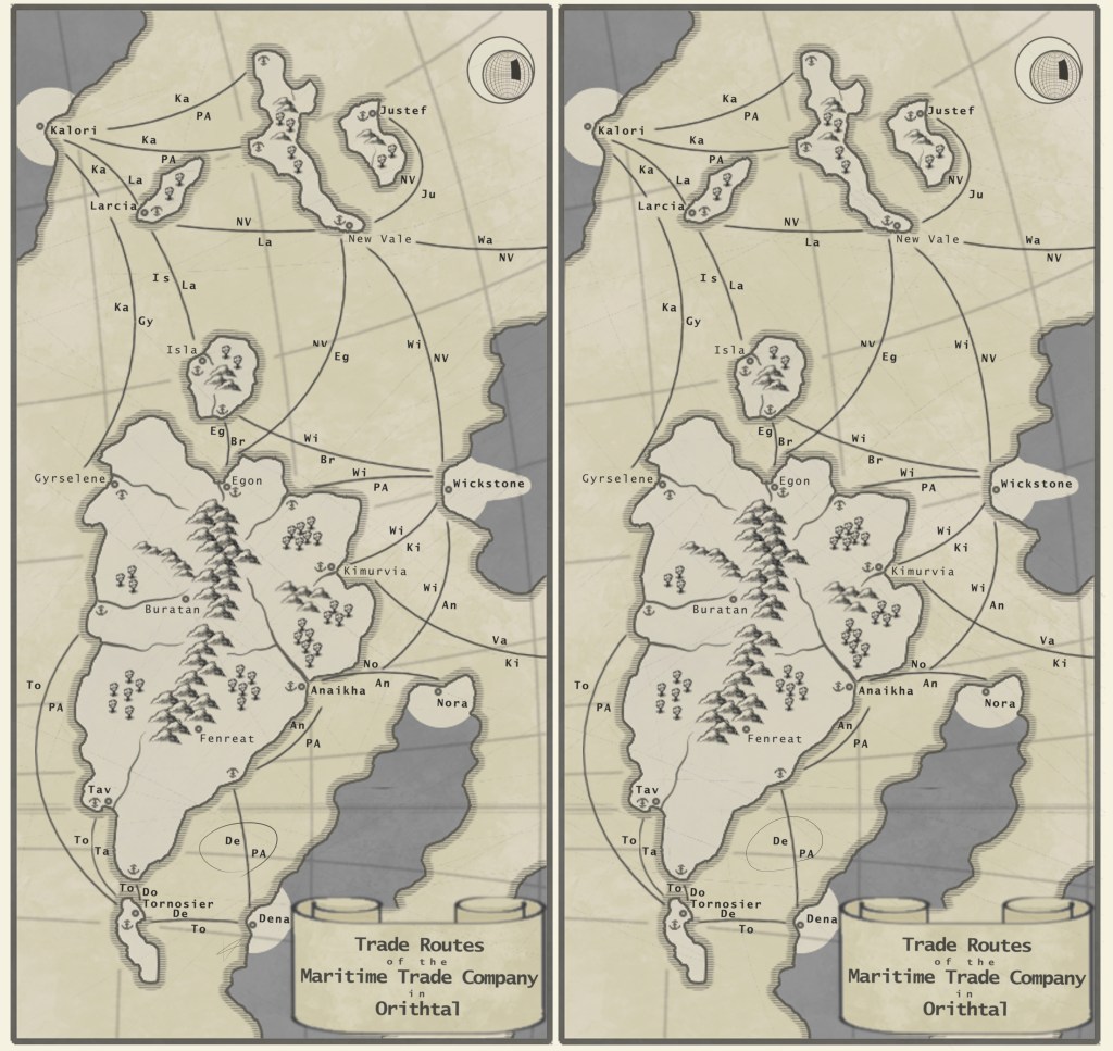This map outlines M.T.C. trade routees around Orithtal. The map on the left is an offical map; whereas the map on the right is a reprint used for smuggling. While they appear identical, the left map has a mark close to Dena. This mark, which looks like an accidental scratch, identifies where an invisible magic seal was placed on the map. Circa, 723 G.E.