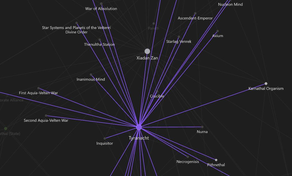 Each lil white node or coloured node is a page and each line is a link to said page. Hovering over one node will show all the connections, and it really is a good way to organize everything. Here’s a lil sneak peak at some future things to show how that all works: